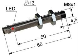 Индуктивный бесконтактный датчик в цилиндрическом латунном корпусе с резьбой М8х1 мм длиной 60 мм. В комплекте две крепежные гайки.
