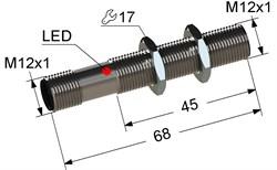 Индуктивный бесконтактный датчик в цилиндрическом латунном корпусе с резьбой М12х1 мм длиной 68 мм. В комплекте две крепежные гайки.