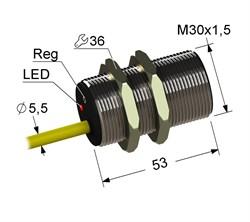 Емкостный бесконтактный датчик в цилиндрическом латунном корпусе с резьбой М30х1.5 мм длиной 53 мм. В комплекте две крепежные гайки.