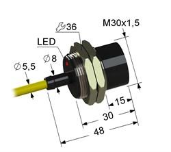 Индуктивный бесконтактный датчик в цилиндрическом латунном корпусе с резьбой М30х1.5 мм длиной 48 мм. В комплекте две крепежные гайки.
