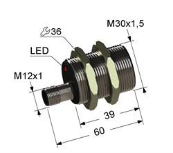 Индуктивный бесконтактный датчик в цилиндрическом латунном корпусе с резьбой М30х1.5 мм длиной 60 мм. В комплекте две крепежные гайки.