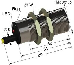 Индуктивный бесконтактный датчик в цилиндрическом латунном корпусе с резьбой М30х1,5 мм длиной 80 мм. В комплекте две крепежные гайки.